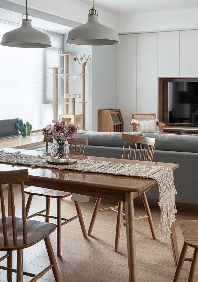 餐厅位于客厅背后,在极简装潢的映衬下,搭配原木桌椅的组合,营造出一种简约自然的大气感。餐桌上装两盏白色吊灯,桌面上布置结绳装饰与花瓶,在飘窗的自然光线折射下,整个空间十分开阔,视觉上显得格外明亮大方。