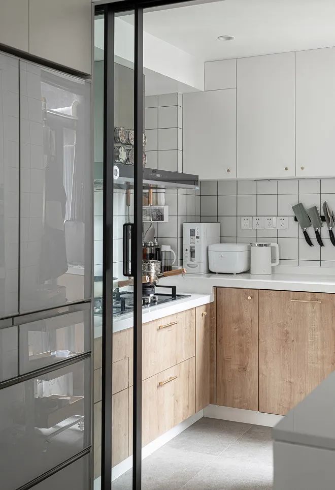 别看厨房不大,但整个操作动线十分合理,同样用原木和白色来升华装修主题。与餐厅边的岛台形成一个外厨设计,让操作更加丰富。
