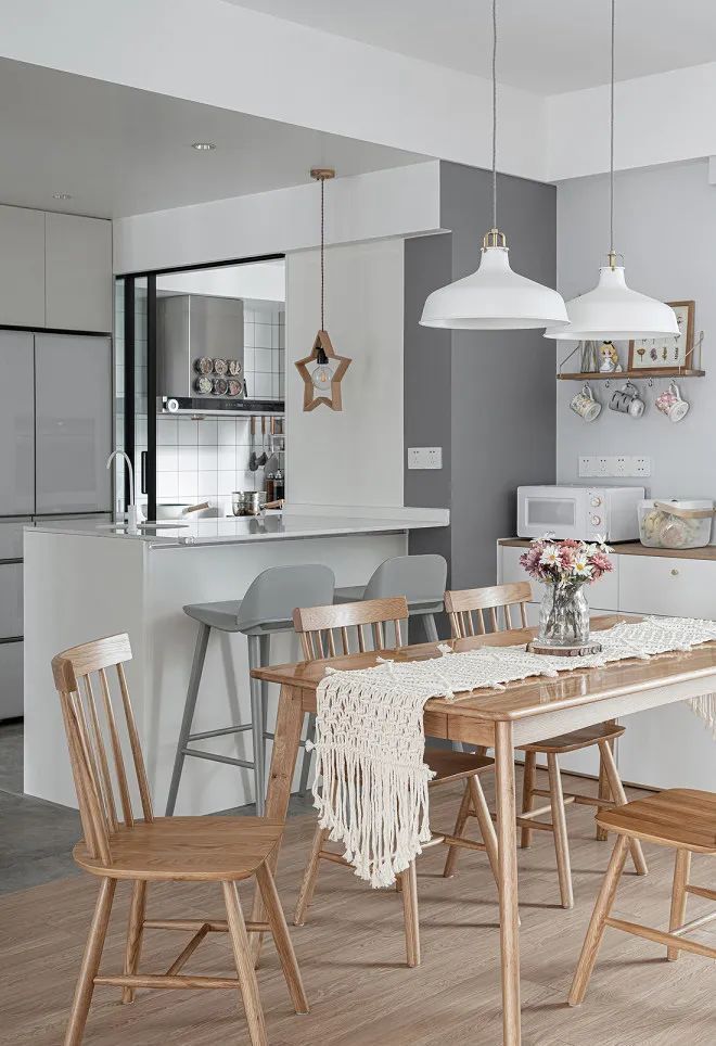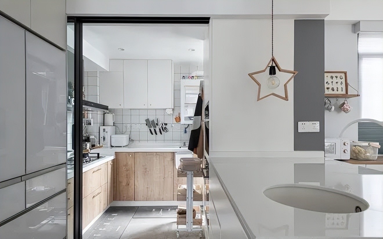 设计师额外将公共区域的部分设计成西厨区,分担厨房的压力。独特的星星吊灯也彰显出女主人主童趣的一面。