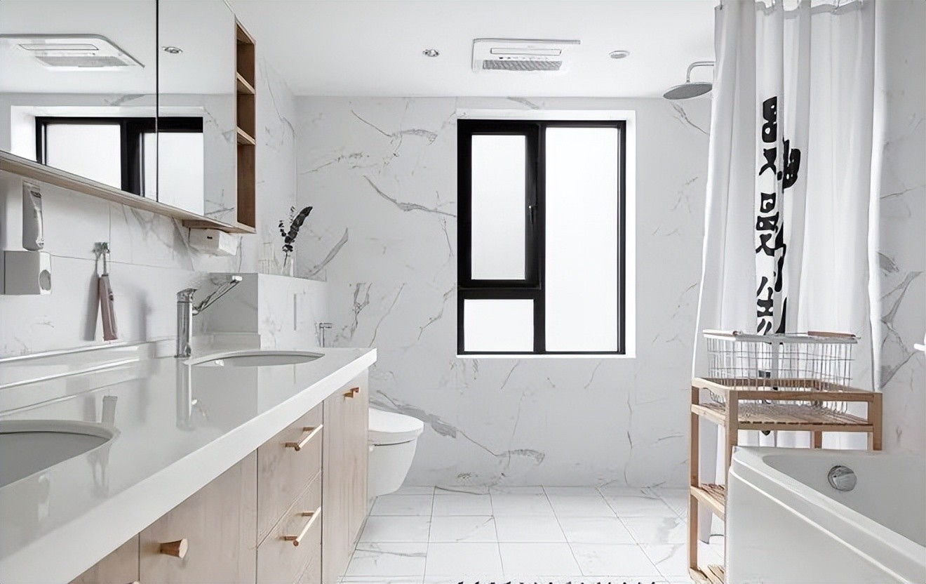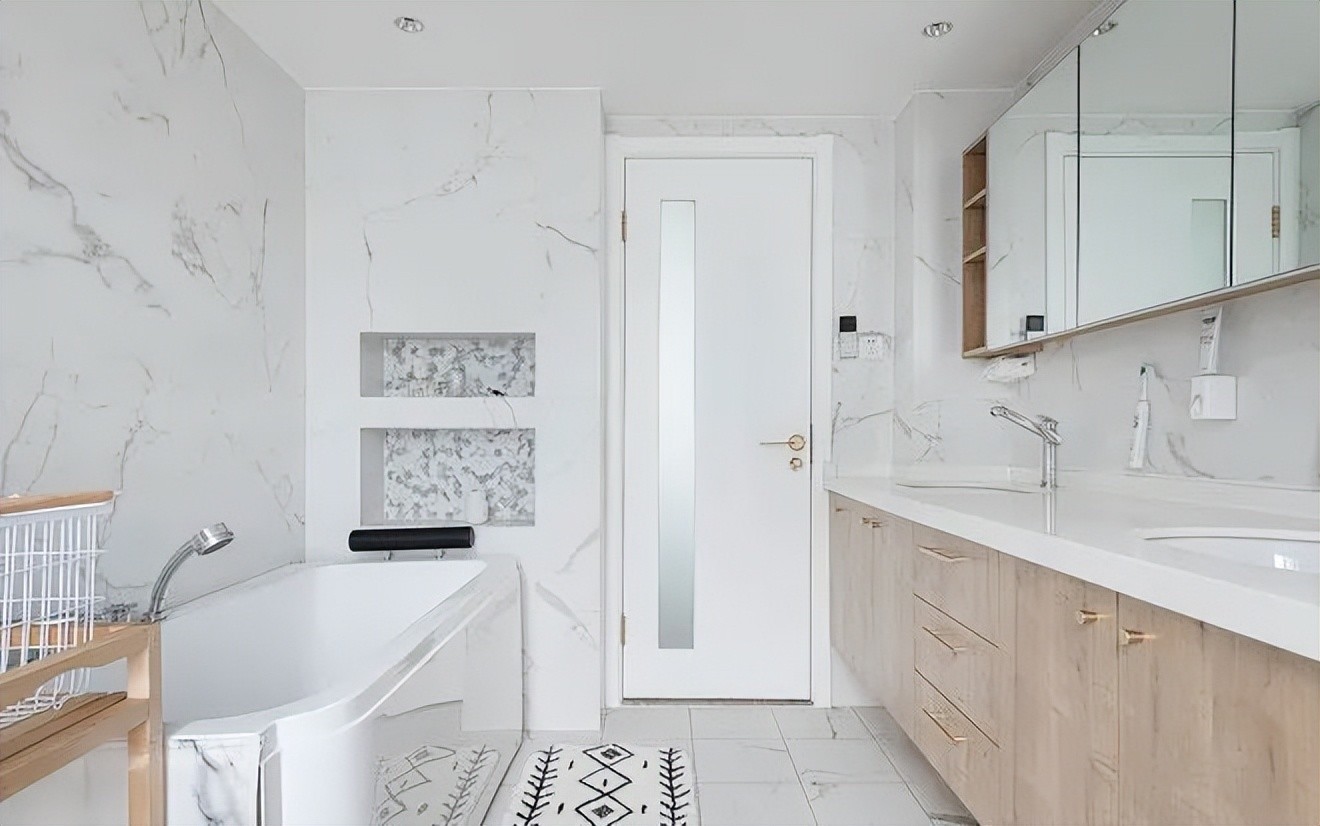 双台盆加浴缸的设计,让卫生间的功能性更强。镜柜的加入,可以收纳各种卫生用品,也让空间更加的干练和整洁。