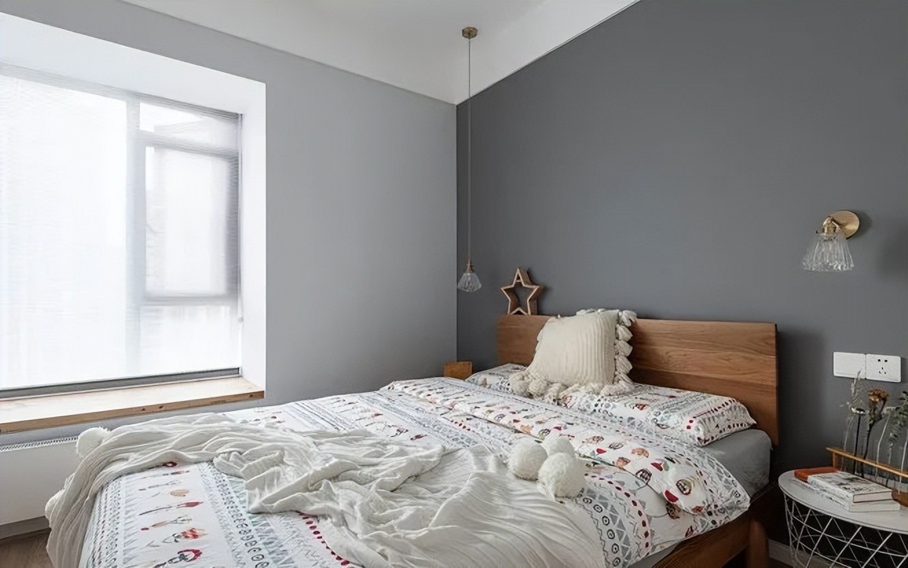 儿童房温暖素雅,床头背景通刷成高级灰,以少量原木点缀,营造出恬静、沉稳之感。同样是无主灯的设计,视觉上显得高挑利落。浅色的床品和搭配白纱帘,整体氛围克制沉静的同时,又不失浪漫的情调。